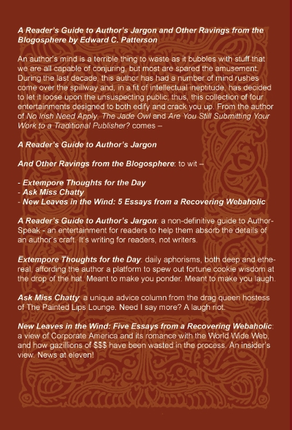 Readers who spend time on Kindle Boards, the Amazon forums, and other ebook websites and blogs should be familiar with prolific author Ed Patterson, since he's active on those sites. He's helped hundreds (or thousands) of would-be authors self-publish and market their books with his very helpful guide, "Are You Still Submitting Your Work to a Traditional Publisher?" Ed is also the creator and driving force behind Operation eBook Drop, a program where authors distribute their books for free to members of the armed forces who are deployed around the world. The author's newest Kindle book, "A Reader's Guide to Author's Jargon and Other Ravings from the Blogosphere," was published recently. I had been looking for an opportunity to use Amazon's new lending library feature, so the new book became my first loaner. The book is a compilation of previously published works by the author, some of which were blog or forum posts. There are four sections to the book: 1. A Reader's Guide to Author's Jargon. This is a glossary of definitions of words and phrases used by authors, editors, and publishers. They're listed in no particular order or grouping, and some are the author's own take on traditional definitions. Some of my favorites were "Hanging a lantern" (the origin of the term actually dates back to silent movies), "Swifties" (derived from the old Tom Swift novels), "Litote" (an understatement created by a double negative), and the ever-popular "Split infinitive" (drives editors nuts). There are dozens of definitions, and any author wannabe would benefit from perusing this section, since many of the definitions/explanations involve writing styles or techniques. 2. Extempore Thoughts for the Day. This was a popular series of daily thoughts - little snippets, actually, kind of like the writings found in fortune cookies, but without lottery numbers - posted on Kindle Boards over a period of about one year. There are 267 of them, ranging from fairly mundane to some pearls of wisdom to the purely whimsical. A few of my favorites: #26 - Books, like chapels or cathedrals, must open their doors for reader meditation. Of course, authors must still pass the collection plate. #74 - Charles Dickens came to me in a dream last night and gave me permission to dangle my participles. Thanks, Chuck, because Jane Austen is due for a visit tonight to teach me how to universally acknowledge everything. #170 - Never regret a path not taken. If taken, you could be dead by now. #175 - Critics and bedbugs have many things in common. They both suck your blood and are difficult to squash. However, at least you can ignore a critic. You're stuck with the bedbugs, although you're food for both. 3. Ask Miss Chatty. Miss Chatty was the nickname of a character in one of the author's novels, The Jade Owl (a first rate action thriller, by the way). Ask Miss Chatty is a fictional advice column written by "Miss Chatty" in response to letters from readers. Some are humorous, some are on the semi-serious and practical side, and some are actually recipes. Several of the letters and Miss Chatty's replies stood out for me: * Advice to a person regarding diabetes (this resonated with me, since I'm diabetic). * A defense of the Greatest Generation and the Baby Boomers who followed, with a skewering of the entitlement generation that we're raising now. * A great-looking curry recipe. * Thoughts on the merits of loose tea versus teabags. * Man's best friend is not a dog. * Practical advice on relieving the pain of a toothache. Many of the letters were laugh-out-loud funny (or groan-out-loud!), including several that involved love and sex, and the sometimes bizarre predicaments that people get into with their love life. Having read The Jade Owl, where Miss Chatty first appeared, I think this was my favorite section of the book, especially with the addition of a chapter from The Jade Owl that involved Miss Chatty, but was cut from the book by an editor. 4. New Leaves in the Wind: Five Essays from a Recovering Webaholic. The author briefly recapped his four decades of employment in the corporate world, including his work as a web designer. He gives a very brief, interesting history of the World Wide Web, then writes about the basics of web design and why many companies - including some big ones - don't make proper use of their websites or spend way too much money on web development with too little in return. He gives some very practical point-by-point steps for designing an effective website and implementing it. For comic relief, there's a section on corporate "Branding Police" and how they make life hell for web designers. The essays in the "New Leaves in the Wind" section were interesting reading; I'm not a web designer and know little about the subject, but I enjoyed the essays. They weren't about the nuts and bolts minutiae of web design, but more the overall approach to the subject and why some websites are more effective than others. That's the book